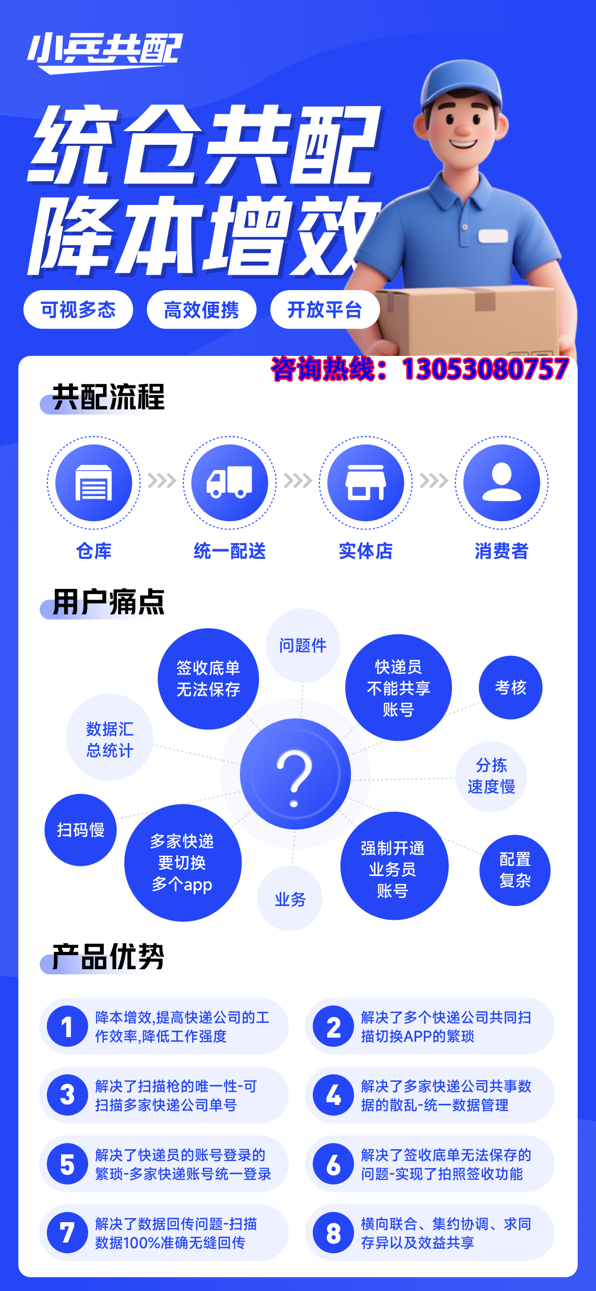 在快递行业从“规模竞争”迈向“效率与服务竞争”的新阶段,末端网点的核心壁垒已不再是“接多少件”,而是“管得多好、配得多准、罚得少不多”。小兵共配系统,正是助力网点跨越这一门槛的关键引擎。它不仅是一套工具,更是一场运营范式的革命——推动快递末端从“劳动密集型”向“技术驱动型”转型升级,为可持续高质量发展筑牢根基。选择小兵共配,就是选择在未来竞争中赢得主动、赢得口碑、赢得未来!